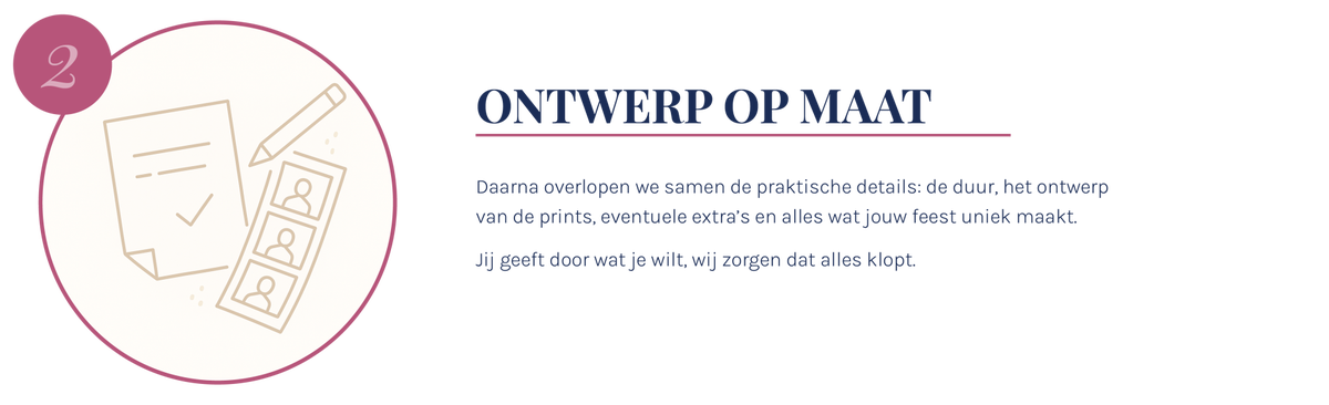 Je fotostrip krijgt een ontwerp dat past bij de sfeer van je feest. Dat kan heel eenvoudig zijn met een naam en datum, of iets volledig op maat.
